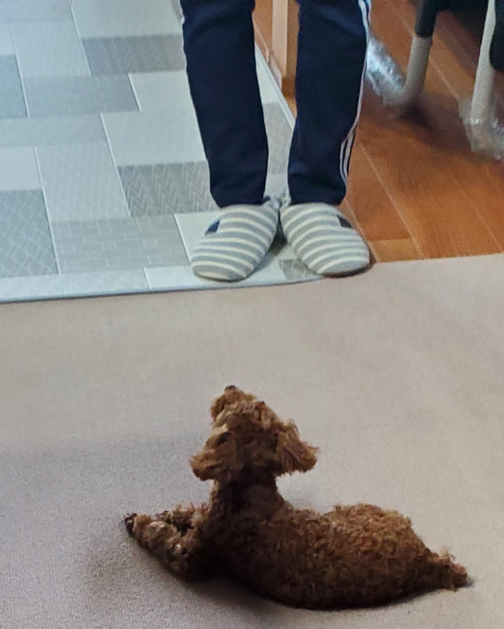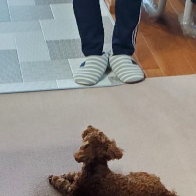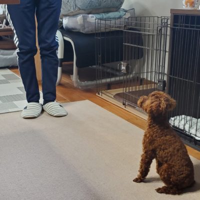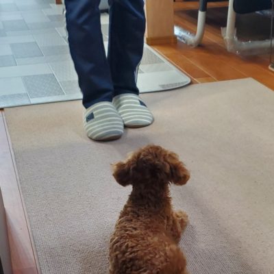 飼い主様、前回お願いしていた課題をしっかりクリアしてくださっていて、お座り(伏せ)待てのレベルアップが出来るようになっています。