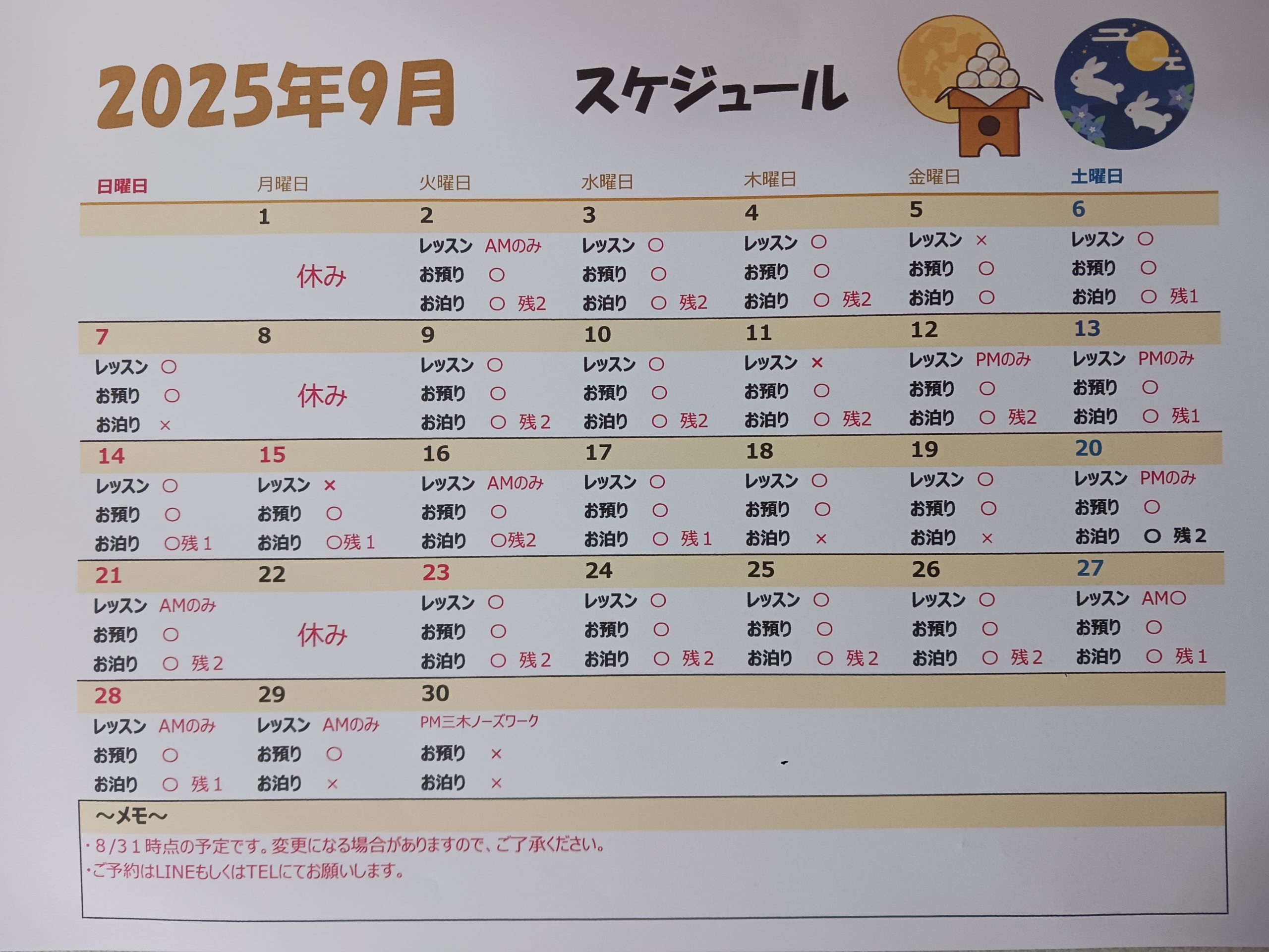9月のスケジュールです。