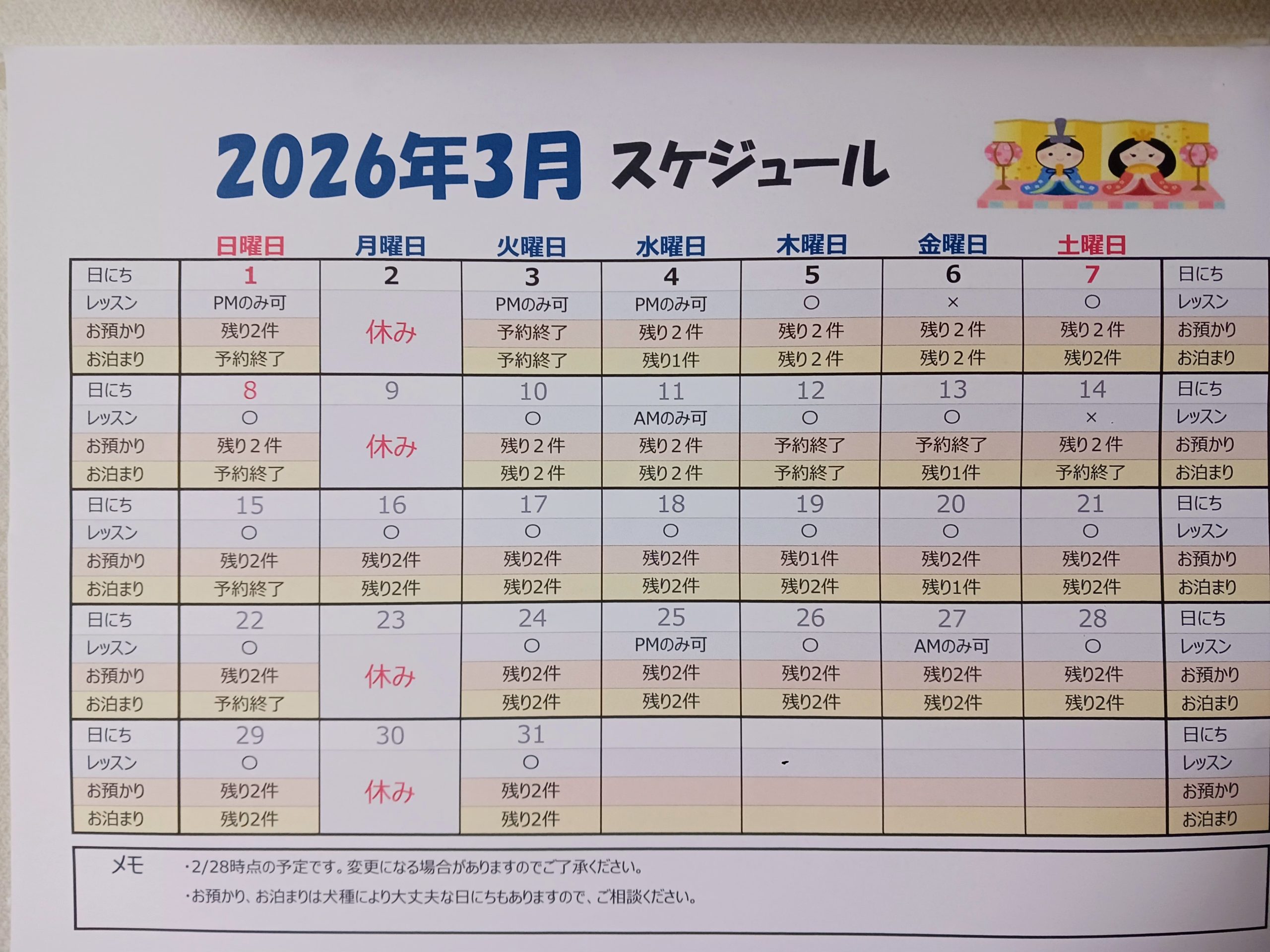3月の予定です。当初お散歩イベントを予定していましたが、日程の関係で申し訳ありませんが、4月に延期しますので、よろしくお願いいたします。